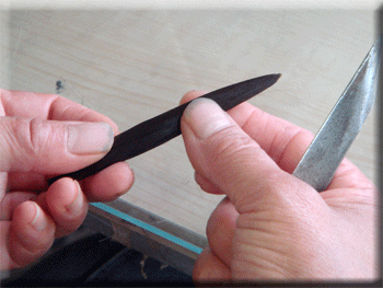 軸の穴を髪の毛の太さに合わせて微妙に調整して削り、髪の毛を軸に接着します。 |