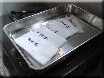 郵送中についた髪の毛のくせを直し、まとめやすくするために鍋で毛を軽く煮ます。 |