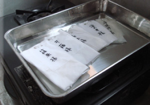 郵送中についた髪の毛のくせを直し、まとめやすくするために鍋で毛を軽く煮ます。他の子の髪の毛と混ざらないように、一人ずつ名前を付けて分けて作っています。