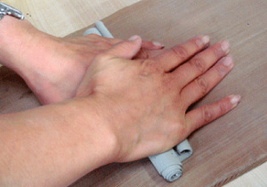 水に濡らした髪の毛を台の上で何度も混ぜて、髪の毛の長さの偏りを均一にします。