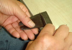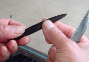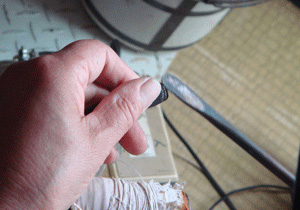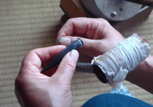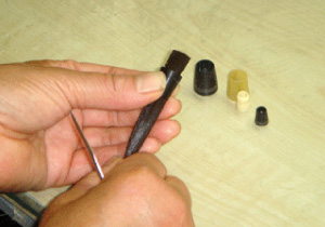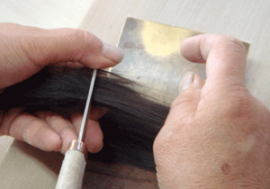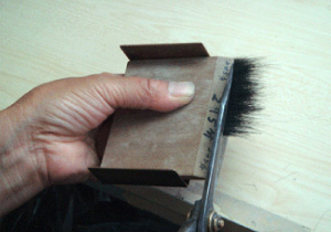 軸の穴を髪の毛の太さに合わせて微妙に調整して削り、髪の毛を軸に接着します。
