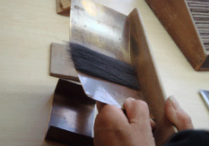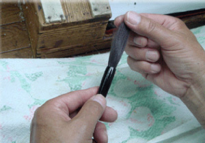 毛をまっすぐにするため、髪の毛に熱を加えた後、もみ殻の灰を髪の毛にまぶし、鹿の皮で包んで揉んでいきます。